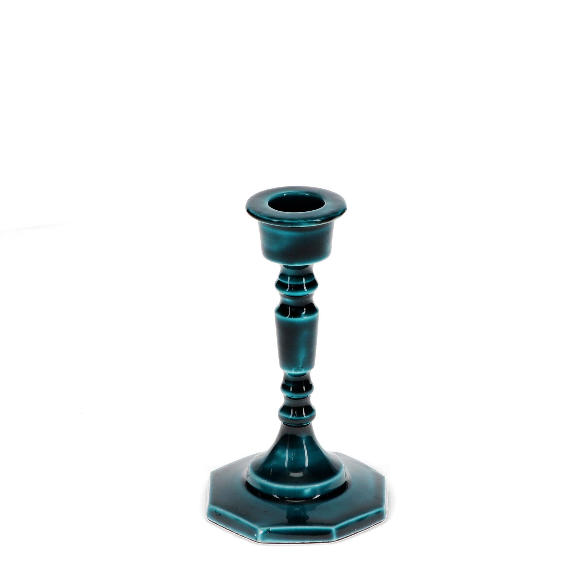 Cast metal candlestick with dark blue enamel finish, elegant thin stem and octagonal base. Its traditional design and striking colour will stand out on any dining table or mantelpiece.