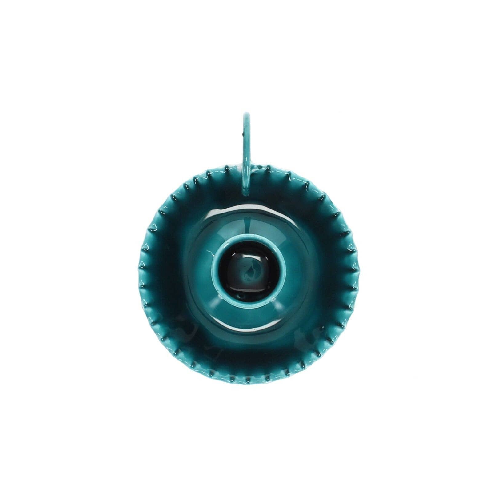 Cast metal candle holder with dark blue enamel finish, made to resemble a chamberstick with its attached handle and small pan to catch dripping wax. Its simple design and striking colour gives a modern twist to a classical item, and will look great on any dining table or bedside table.